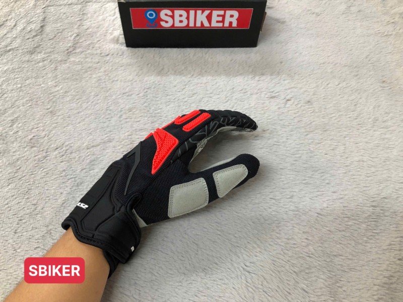 Phần thân găng tay sử dụng vải tổng hợp kết hợp da tổng hợp và lưới thoáng khí, giúp giảm bí tay khi di chuyển dưới trời nóng. Mặt trong được gia cố lớp cao su chống trượt, giúp cầm lái chắc chắn, an toàn hơn khi điều khiển xe máy tốc độ cao.